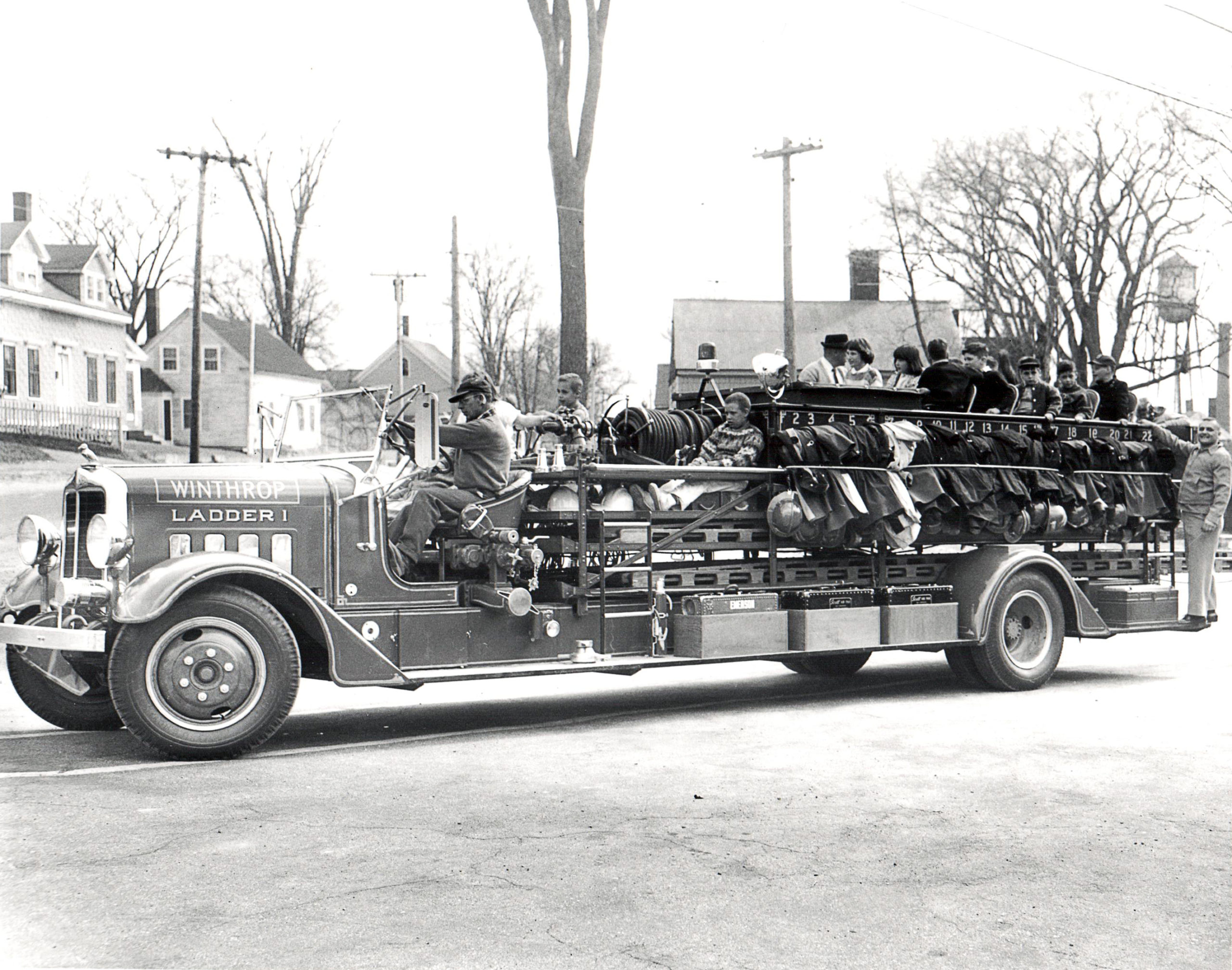 1967 Winthrop Fire Open House. Elwood Raymond driving and Hartley Palleschi standing in back.