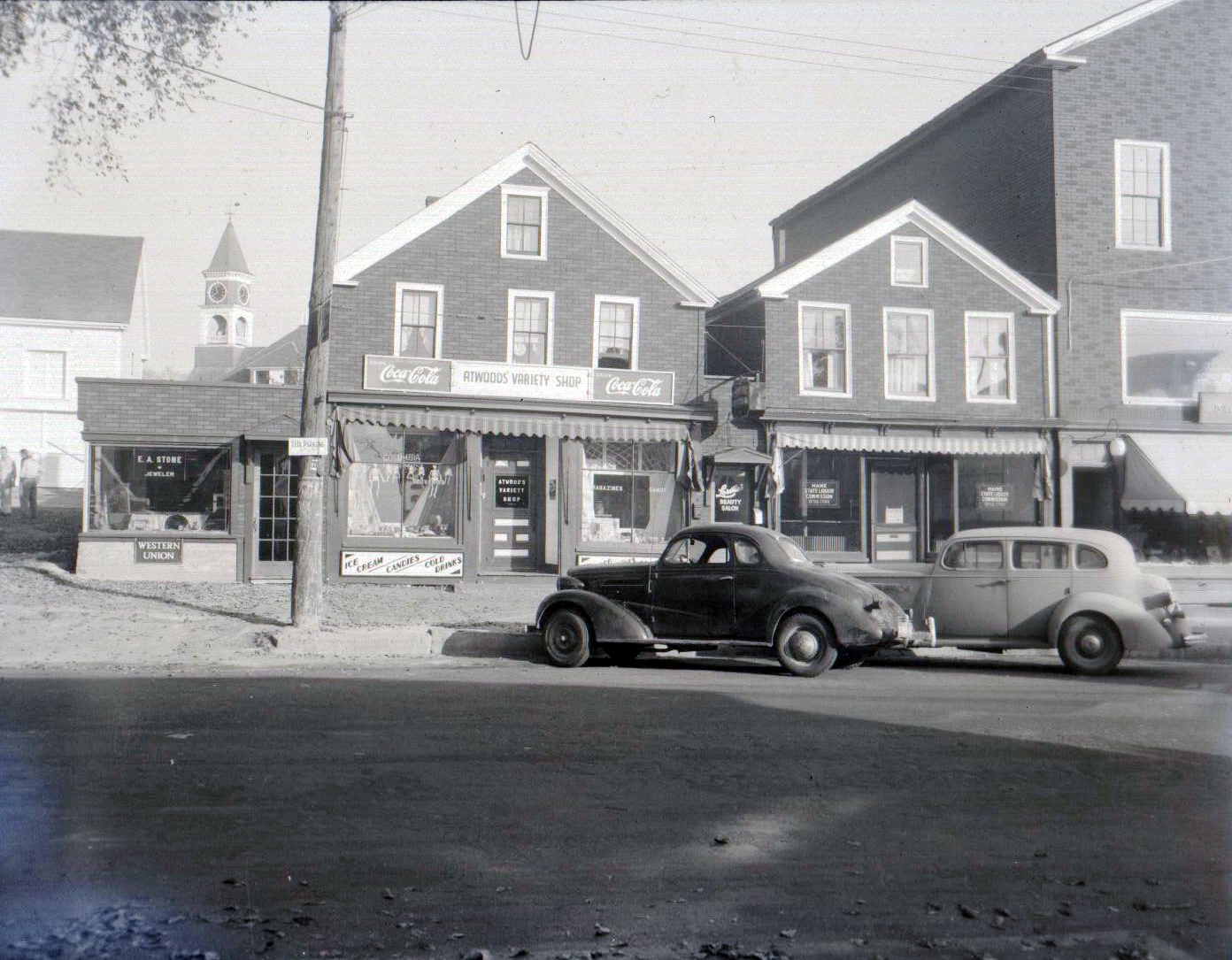 Main Street in 1948. Elmer Stone Jewelry (E.A. Stone) & Earl Atwood Variety Store (Atwoods Variety Shop).