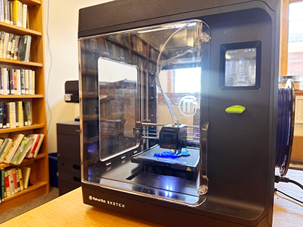 The library currently has a MakerBot Sketch 3D printer for our free 3D printing service. The printer resides at the reference desk in the adult wing of the library and is managed by the Adult Services Librarian. We use PLA filament for all 3D print requests and the Sketch printer has an enclosed printing platform.